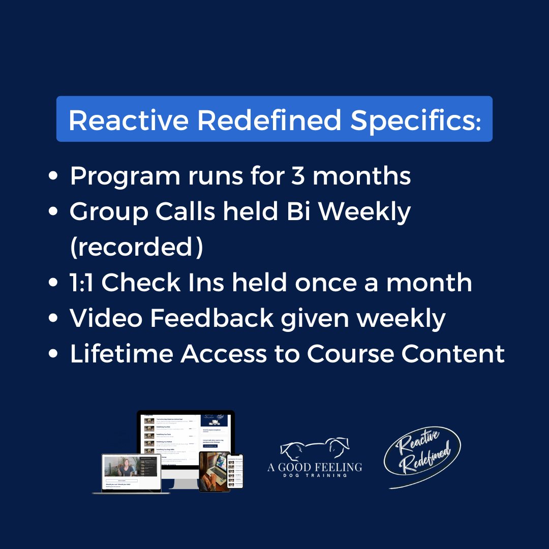 If you worked with us individually - you'd expect to spend $2500+ for the same level of support and the same amount of content. With Reactive Redefined you receive LIFETIME access to training content, one-on-one touchbases, and priceless group coaching calls to breakdown the challenges of owning a reactive dog.